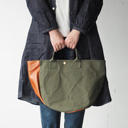 | 岡山県・倉敷産の9号帆布 × 姫路レザーを使用したトートバッグ コロンとしたフォルムに、アシンメトリーなデザインが個性的 |