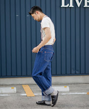 1900年当初のワークパンツとして印象が強いディテールを採用した、ダックテールのシルエットやバックヨークの巻縫いがヨーク高になったワークなつくりに加え、センターループはオフセット、サスペンダーボタンにポケットの補強にむき出しリベットなど、随所に各年代のディテールを組み合わせたつくりです。