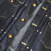 | 『ラングラータイプ111MJ』 の特徴は、フロントのボタンライン両端にある二本のプリーツです。プリーツを固定するために、「丸カン」と呼ばれるカンヌキ留めが施されており、黄色のステッチがデザインのアクセントにもなっています。 生地は、昔ながらのシャトル織機(旧式力織機)で織り上げています。縮みやよじれの防止加工をせず、毛焼きで毛羽立ちを除くこともしていない、織りたての「生機」(きばた)を使用。 また、厚手で丈夫な16オンスのデニム生地を採用しています。 |