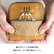 ![]() スマートキーを1つずつ、革で仕切られたポケットに収納できるので、 スマートキー同士がぶつかって傷つくことはありません。 その他のポケットには、カード類・紙幣などが収納可能。 「マチ」によって程よく開くので、中身を取り出しやすいのも魅力です。 ![]() 3本の鍵を平たく並ベて収納することで、厚みが抑えられています。 適度な膨らみと、鍵が動かないようホールド感を持たす為に、 絶妙な長さに切り込みが調整されています。