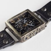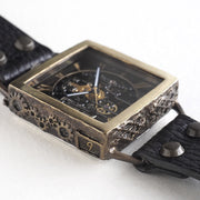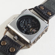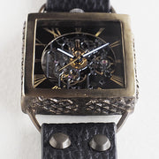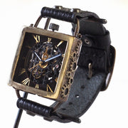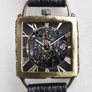 真鍮製のケースのアンティークな雰囲気とスケルトンのブラックムーブメントが スチームパンクな世界観を感じさせてくれます。