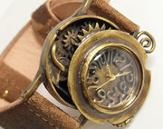 時計がイタズラそうに蓋をずらして、中身をチラっと見せてくれているような、動きのあるデザインの手作り腕時計!歯車など、時計の部品を思わせるモチーフがポイント。