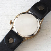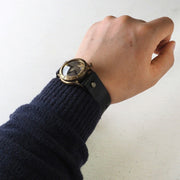 | ひとつひとつ手作りで腕時計を制作されている腕時計作家・渡辺工房の渡辺正明さんの作る手作り腕時計。ケース、文字盤、ベルトといった時計のパーツ制作から組み立てまで、すべてを手作業で仕上げています。カジュアルにもビジネスにも使えるシンプルデザインのものから、創意工夫が凝らされた個性派モデルまで、その作品のバリエーションは豊富。 ありそうでなかった、時分と分をがっつり重ねたデザイン。ケース内側と外側に分けることで、視認性に優れたアイテムとなっています。 4時の位置にある小さな窓から、カレンダーの日付が顔をのぞかせています。デザイン性の高さに加え、実用性にも優れた腕時計。 定番の可愛らしい印象の刻印数字が、手作りならではの温かみを惹きたてています。真鍮製のケースは、使い込むほどに色が深みを増し、自分だけの味が出てきます。 風合い豊かな真鍮の表情を楽しみながら、時間を感じることが出来ます。 何時かな?…ふと時計を見た時に、そのつど時計が表情を変えていく様子がわかり、ゆったりとした時間の流れを時計と一緒にお楽しみいただけます。 ご自分用としてはもちろん、誕生日、クリスマス、バレンタイン、ホワイトデー、バースデーなどのギフト・プレゼントにもおすすめ。ラッピングをご希望の方は、ご注文時の備考欄(自由記入欄)にてお伝え下さいませ。 |