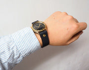 | 渡辺さんの作品の中でもめずしいブラックの文字盤に真鍮のバーインデックスモデルにするなど、これまでになくシックで大人っぽいモデルが登場。真鍮のゴールドが華やかさをプラス。すべてが手作業で作られているため、シンプルなデザインの中にもこだわりがつまった魅力的な腕時計。 |
