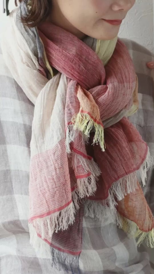 | A thin linen cotton stole with a beautiful bi-color variation. The natural wrinkles do not cling to your skin, making it smooth and comfortable. |