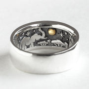 A silver ring depicting a scene of a rabbit quietly gazing at the moon in a flower-filled night meadow, rendered in a wood carving-like style.
