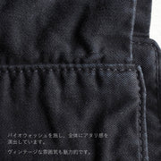 The processing makes parts of the surface of the fabric turn whitish in places, giving it a worn, well-used look.After sewing into the shape of the bag (after the product is completed), it is dyed using reactive dyes. Immediately after dyeing, it is bio-washed (washed with chemicals) to create a worn look throughout.