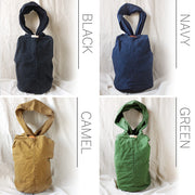 A cylindrical one-shoulder backpack made of crumpled canvas. It has a very simple structure with no zippers or snaps, so you can easily see what's inside and put it on your shoulder in one action, making it useful in a variety of situations.