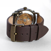 The skeleton design allows the internal mechanism to be seen, making you feel the heartbeat of the machine itself as it ticks away time, making even the act of winding the mainspring a special moment.