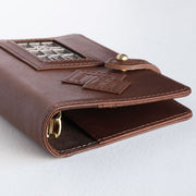 A genuine leather antique door system planner cover with a small stained glass window.