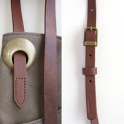 Nuanced color ash gray canvas fabric. The moderately glossy genuine leather handle creates a high-quality atmosphere. The antique metal fittings are not overly decorated, giving a mature and sophisticated impression.