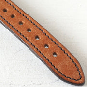 | "Pueblo" is a vegetable tanned leather made by Badarassi Carro in Florence, Italy, using the traditional "Vacchetta" method, in which oil extracted from cow's legs is slowly soaked into the leather. Each piece of leather is sanded by hand, giving it a unique uneven texture and vintage look. The more you use it, the more it develops a character that can't be found with other leathers. Pueblo is a thin leather, just under 2mm thick, so the back of the belt is made of two layers of leather, with lacette-tanned pigskin, which is gentle on the skin, attached and sewn together. |