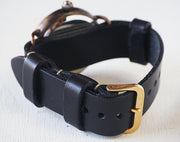 | A thick round brass case that has been dyed black to create a military watch with a classical atmosphere. It has a simple and easy-to-read design with white and red letters on a black dial. The case has an antique black finish, and the crown is positioned at 9 o'clock. The brass case, which has a unique warm texture, and the contrasting cool monotone dial match perfectly. The diameter of the case is about 38mm, which is a large size and has an outstanding presence! The simple and timeless design can be worn regardless of the occasion or outfit. |