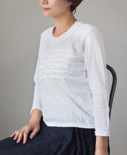 The round neck and cuffs are decorated with a bushy trimmed design that makes this simple shirt look stylish.