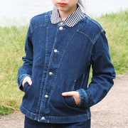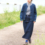 "DEEP BLUE" is a women's denim brand born in Kojima, Kurashiki City, Okayama Prefecture. Since its founding in 1948, Maeno Co., Ltd., a long-established store that has been producing workwear and school uniforms in Kojima for many years, has been working on this brand since 2001. Introducing a collarless jacket with a feminine silhouette. The 10 oz and light fabric makes it easy to put on.