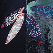 | A hand-painted and remade T-shirt with a large and bold drawing of bamboo using a method of drawing that makes use of blurring. The bamboo leaves just below the chest are stitched and sewn to imitate a Japanese patterned fabric, giving it a casual and three-dimensional finish that cannot be expressed by hand-drawing alone. Sitting leaning against bamboo is a lovely panda. The playful expression is cute. |