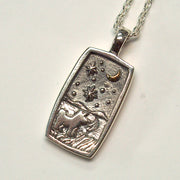 | A puppy version of Moge's "We Were Watching the Same Moon" series. The "We Were Watching the Same Moon" series is characterized by a somewhat sad, yet warm atmosphere, but this puppy-themed necklace has a strong cute impression and a casual design that can be worn without feeling too self-conscious. The "We were looking at the same moon" series features a design in which animals are looking up at the moon, accented with 18k gold. The contrast between the innocence of the puppy and the crescent moon creates an indescribable atmosphere. Dogs have the habit of howling to get in touch with friends who are far away, so this is the perfect gift to show your connection to a loved one who is far away. A smart and charming necklace with a soft, fluffy silhouette without any sharp corners, and a neat, vertically long rectangle. The pendant is about 3.5mm thick, giving it a moderate weight and presence. While retaining the elegant atmosphere of silver, the silhouettes of puppies and stars are warm, almost like wood carvings, making this a necklace that will soothe you every time you look at it. |