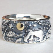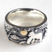 草むらの中に静かにたたずむウサギが夜空を見上げているシーンを、ふっくら丸みのあるリングの中にまるで木彫りのような温かみを放つようにデザインされたシルバーのリング。