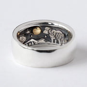 This silver ring features a woodcarving-like design of a sheep standing quietly in nature, gazing up at the moon.