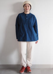 Classic henley neck.The buttons are also indigo dyed and slightly blue.