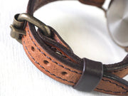 The buckle metal part is made of brass material with an antique feel, giving it a nice atmosphere. It matches well with a high-quality belt.