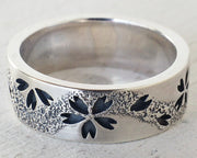 The smoked finish has a clear and three-dimensional cherry blossom pattern, and is a beautiful design that catches the eye. Men can wear it without discomfort, and it goes well with Japanese clothes such as kimono! The smooth silver texture is comfortable to wear and fits nicely on your fingers. The ring width is 7mm and has a moderate presence, and is recommended as an accent for coordination. This item is easy to match with both Japanese and Western clothing.
