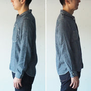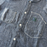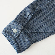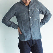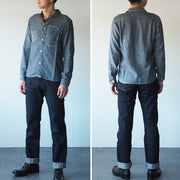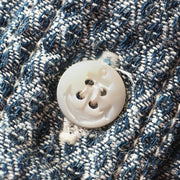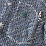 A casual and stylish design accented with asymmetrical chest pockets. The subdued colors make it easy to match with your casual items. The selvedge jacquard fabric with fine rhombus patterns uses yarn dyed with indigo rope for the warp. By using black weft threads, you can experience natural color fading just like denim.
