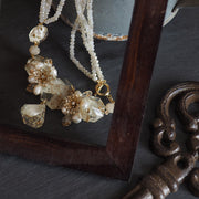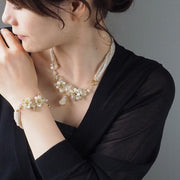 The striking top is adorned with plenty of bijoux made of clear resin and freshwater pearls, giving it a voluminous yet modest impression. The diamond-shaped drop parts hanging from the top sway gently, drawing attention to the movement of the necklace.