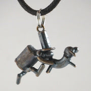 | Leather cord necklace with bronze charms. The bronze is "Kobito-san" trying to catch the buttocks of a roaring dog. The length of the leather strap can be easily changed by simply pulling it. Adjustable between the shortest 47cm and the longest 66cm. |