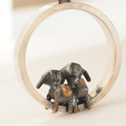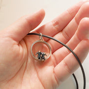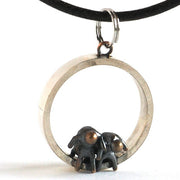 A leather cord necklace with a bronze charm inside a silver ring. Two small dogs snuggled up are represented in bronze.