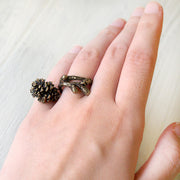 A pine cone with a pop and volume, and a bud that snuggles up to it. A natural ring with a plump pine cone that gives off a strong presence.