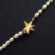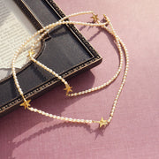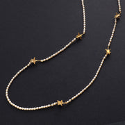 A simple and fairytale long necklace that tickles the girlish heart. The elegant pearl base is accented with subtle sparkling stars.