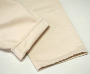 | It has a simple 5-pocket design. The coin pocket has a cute shape. You can enjoy watching the rivets change as you wear them. The fabric is a moderately thick 100% cotton off-white material, which is essential for a natural style. The napped texture is also a plus. |