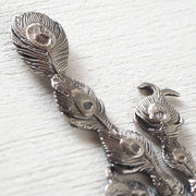 A brooch with a peacock motif, with large decorative feathers spread gracefully.