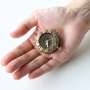 The thick brass case has an antique, well-worn finish, and the back cover has a stainless steel support so it can stand on its own.