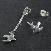Fashionable earrings with an asymmetric design, one with a small bird and crescent moon, and the other with a simple bird.