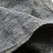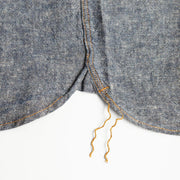 | The fabric is oxford chambray, a blend of cotton and linen. The smooth and comfortable texture gives it a work-like feel. |