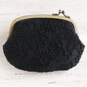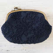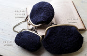 It is a gamaguchi of a very gorgeous loan over lace with a floral pattern embroidered on a navy blue fabric using the same color thread.