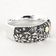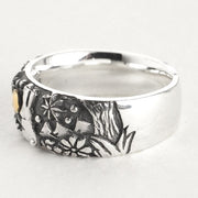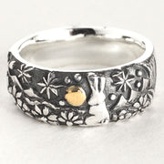 This silver ring depicts a rabbit standing quietly in the grass gazing up at the night sky, and its plump, rounded design gives off a warmth reminiscent of a wood carving.