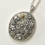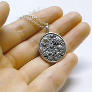 This pendant has a humorous and adorable picture book-like design of a frog sitting hidden in the shade of flowers and plants, gazing at the moon.