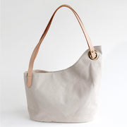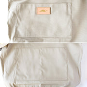 The off-white canvas fabric is basic and easy to use. The moderately glossy genuine leather handles create a high-quality atmosphere. The antique metal fittings are not overly decorative and give a sophisticated impression.