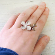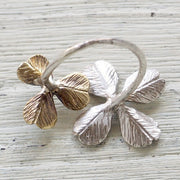 This ring has a natural feel with a large silver four-leaf clover and a brass three-leaf clover gently overlapping each other. It also looks like they are swaying in the wind.