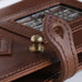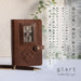 | A genuine leather antique door system planner cover with a small stained glass window. |