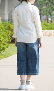 | "DEEP BLUE" is a women's denim brand born in Kojima, Kurashiki City, Okayama Prefecture. These are half-length gardening pants that you can wear all year round. It features a large double pocket and a rustic NEP fabric. The wide silhouette with a mature atmosphere and the used processing are fashionable. Below knee length. |