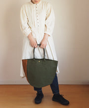 | A tote bag made from No. 9 canvas and Tochigi leather from Kurashiki, Okayama Prefecture. A unique asymmetric design with a rounded form |