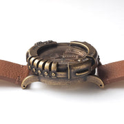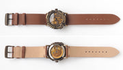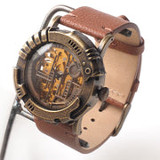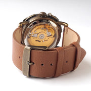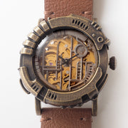 | Functions and Materials | [Movement] Mechanical, automatic with hand-winding function / 3 hands (Made in Japan) [Case] Brass / Case back and buckle are stainless steel [Belt] Vegan leather (light brown) [Windshield] Glass |