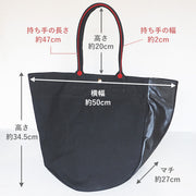 | Size/Weight | [Body] Width: Approx. 50 cm x Height: Approx. 34.5 cm x Depth: Approx. 27 cm [Handle] Length: Approx. 47 cm x Width: Approx. 2 cm x Height: Approx. 20 cm [Inner pocket (with partition)] Width: Approx. 13.5cm x Height: Approx. 13cm / Width: Approx. 9cm x Height: Approx. 13cm [Weight] about 480g * There are some individual differences in size. |