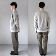 Raffi yarn, which was born in Osaka, is knitted into sweatshirt fabric in Wakayama, one of Japan's leading knitting production areas. The sinker knitting machine has been finely adjusted to reproduce a texture similar to that of fabric knitted with an old-fashioned loop knitting machine. The loose yet precisely woven sweat fabric is flexible and stretchy, making it difficult to lose its shape.