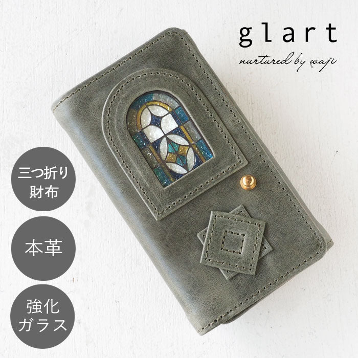 glart Stained Glass Antique Door Trifold Wallet, Khaki, Women's [H0212-KH]. Real Glass, Genuine Leather, Leather Wallet, Leather Accessories, Brand Name Trifold Wallet, Compact, Mini Wallet, Leather