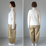 The yarn that started Kepani is made from raffi yarn, which is popular as a pioneer of vintage and recycled materials. It is spun at a long-established textile factory in Osaka together with extra-long staple Turpan cotton and Giza American cotton with a lot of short fibers, resulting in a yarn with a soft texture and natural unevenness.